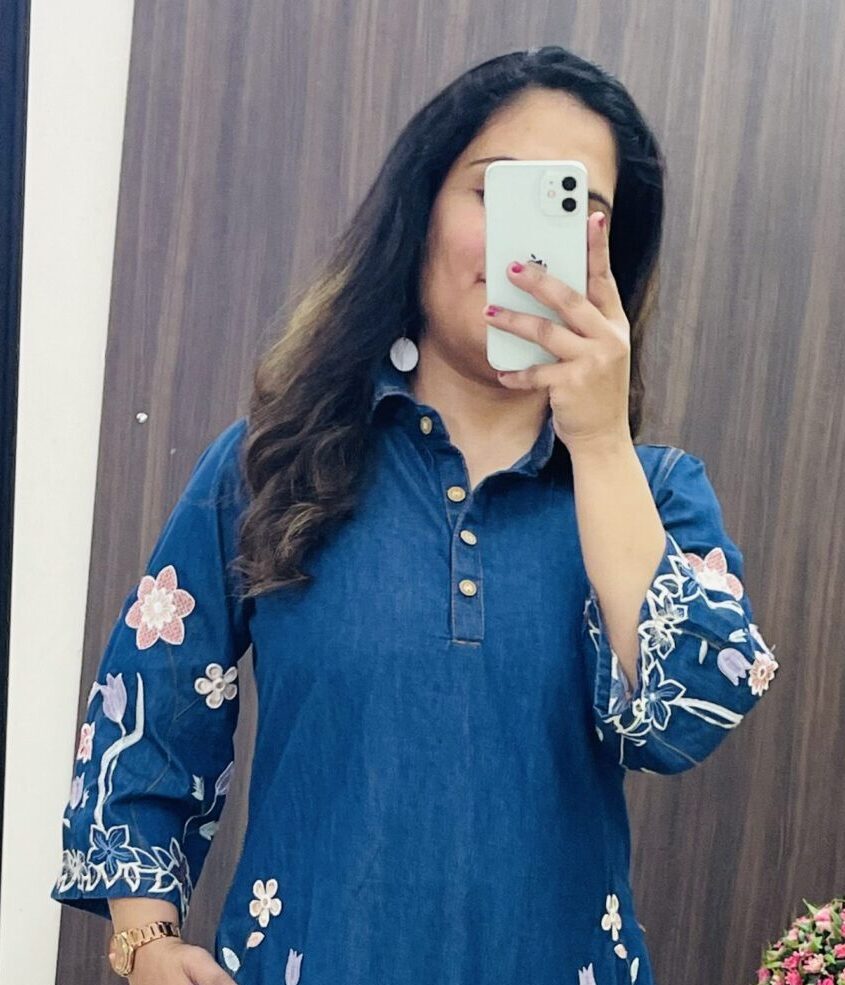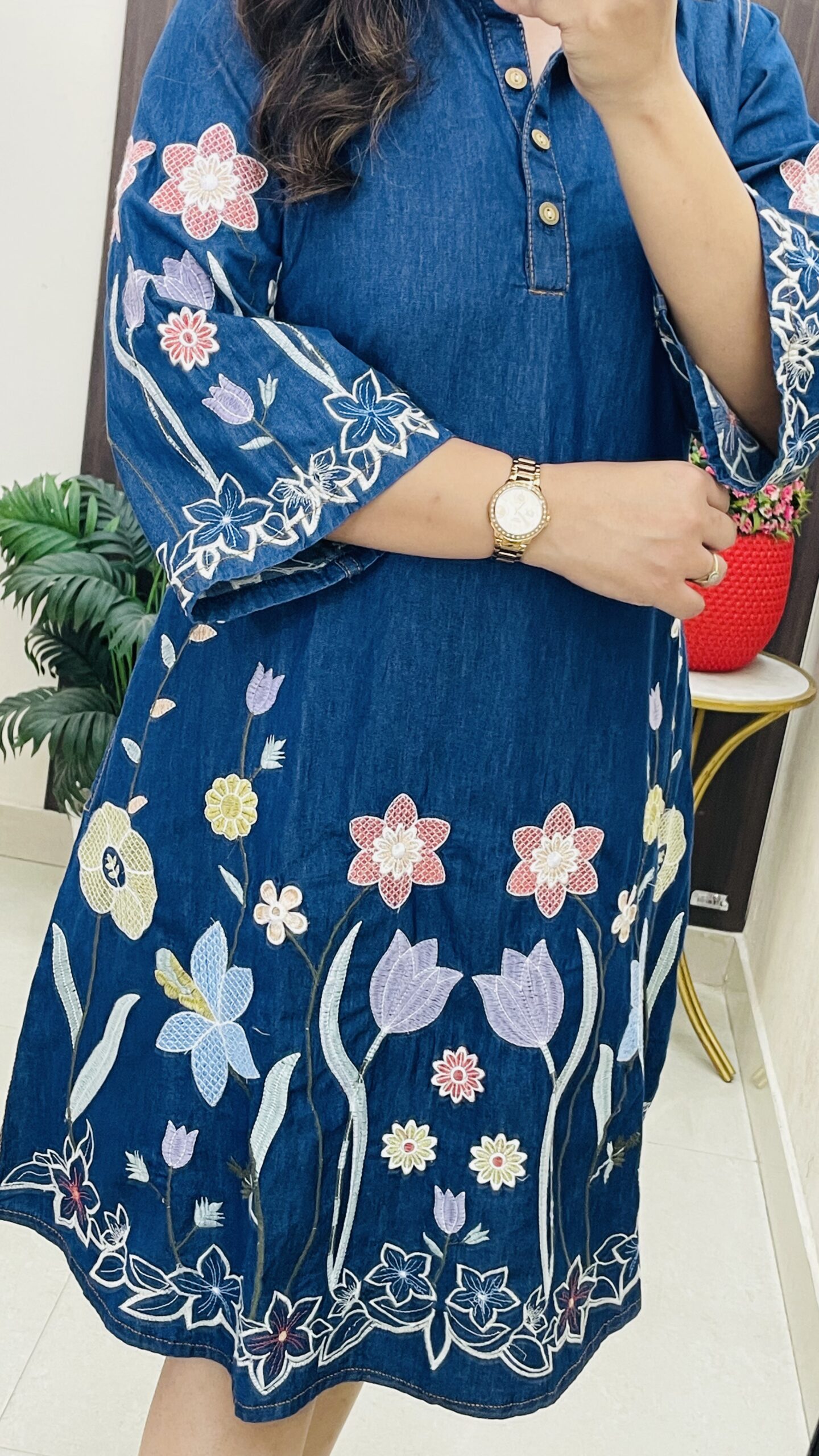 Premium Denim Middi with applique work and middi dress with openable buttons and pretty sleeves and both side deep mobile pockets.