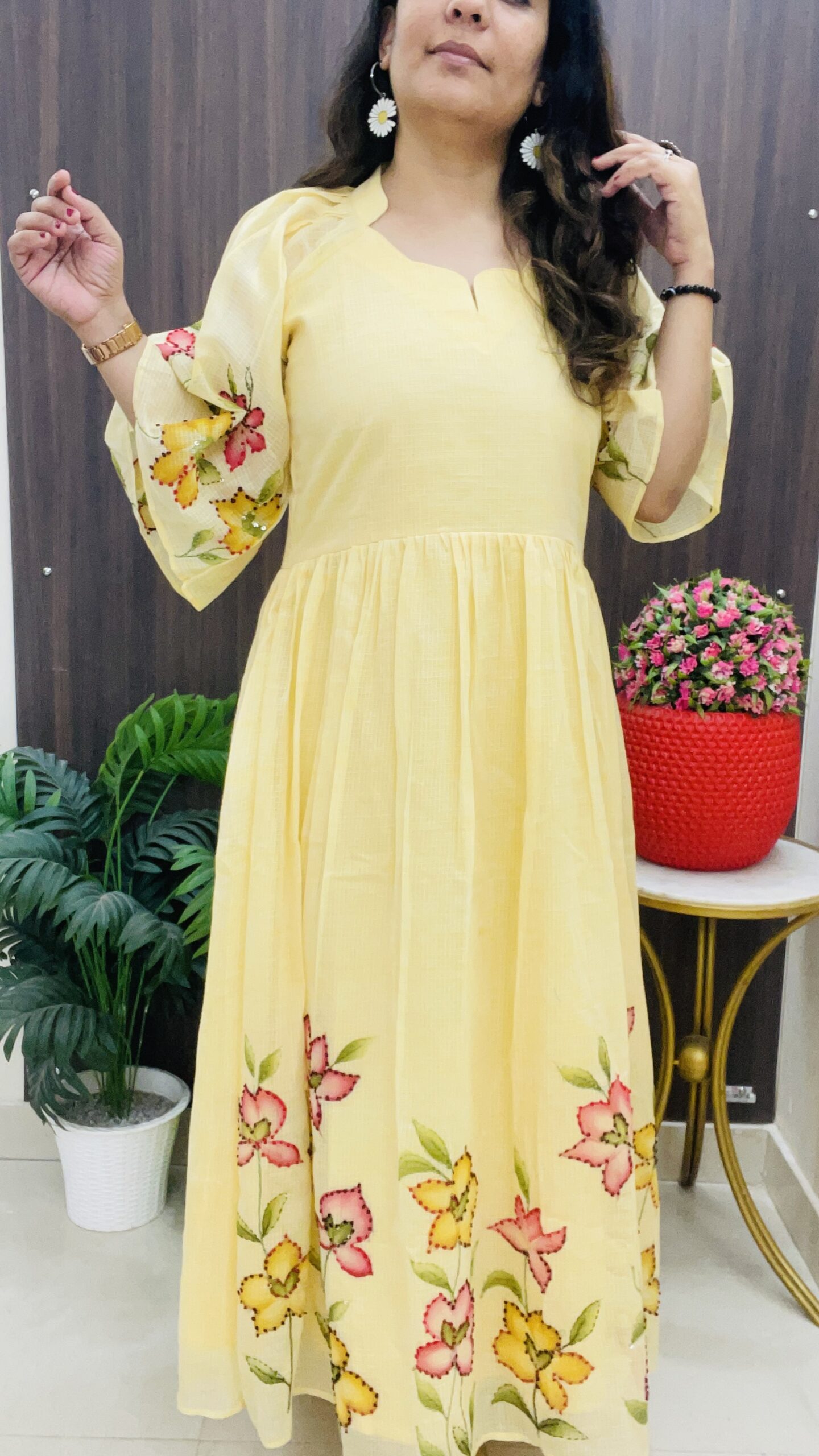 Step out in radiant elegance with our exquisite Handpainted Kota Doriya Dress. This beautiful piece captures the essence of spring with its vibrant floral artwork, set against a delightful sunshine yellow hue. Perfect for a daytime event, a festive gathering, or a stylish casual outing, this dress is a true testament to traditional artistry and contemporary style.