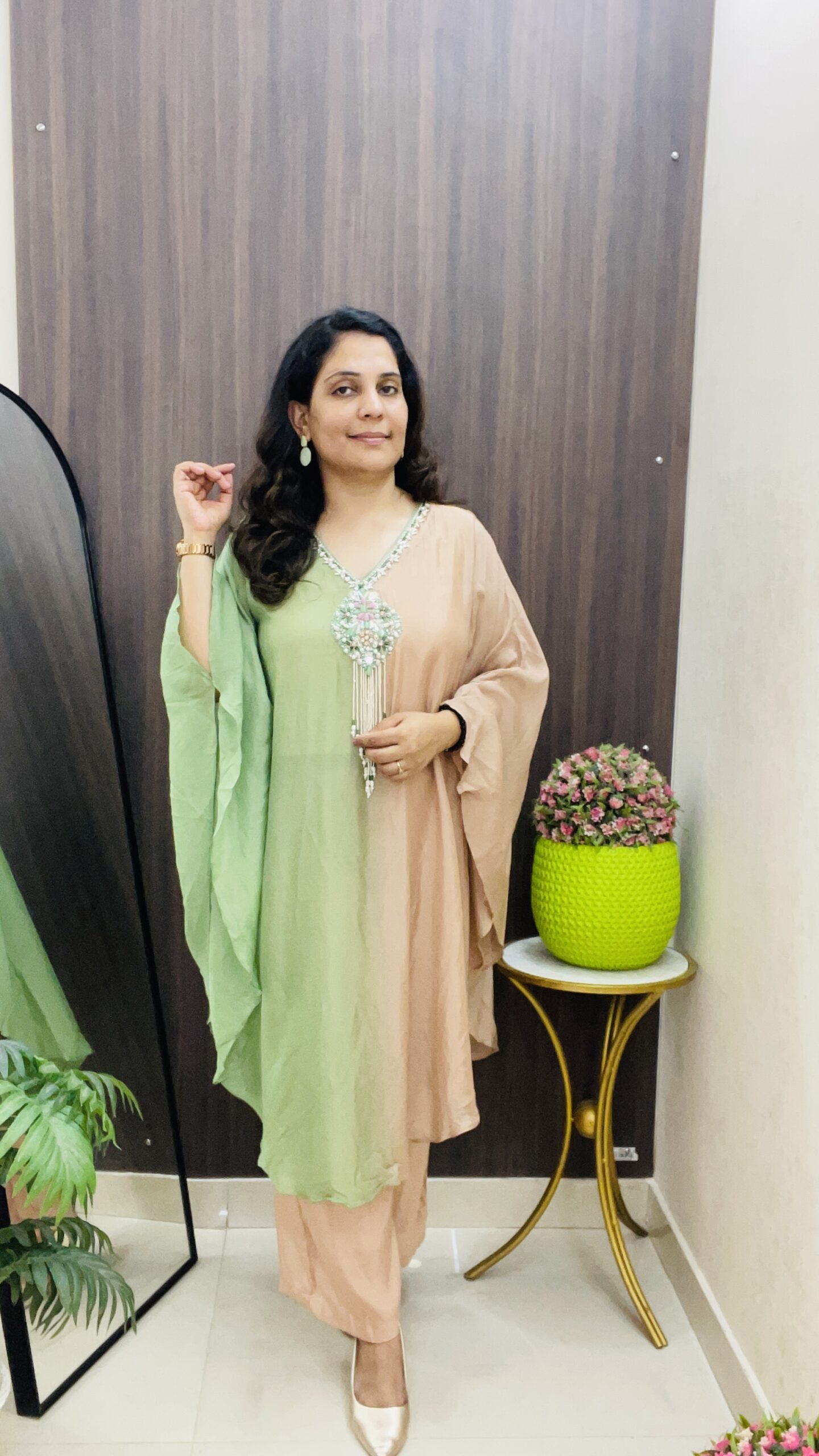 • Design: A stunning two-tone ombre effect, transitioning gracefully from a soft mint green to a warm blush peach or nude.
