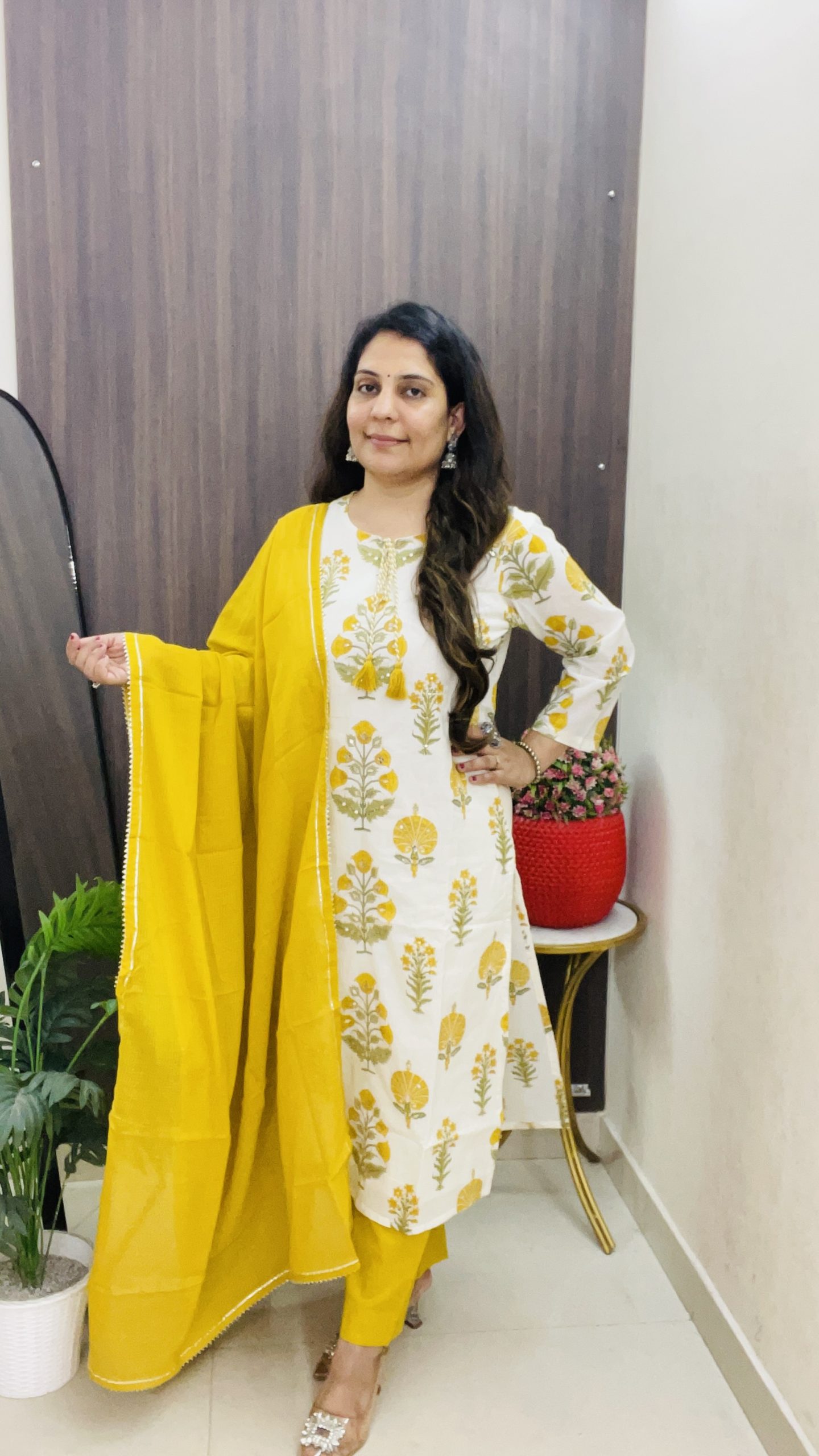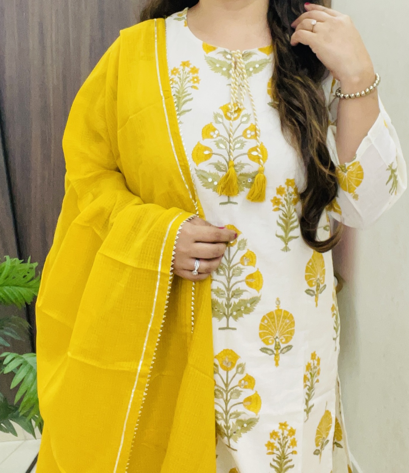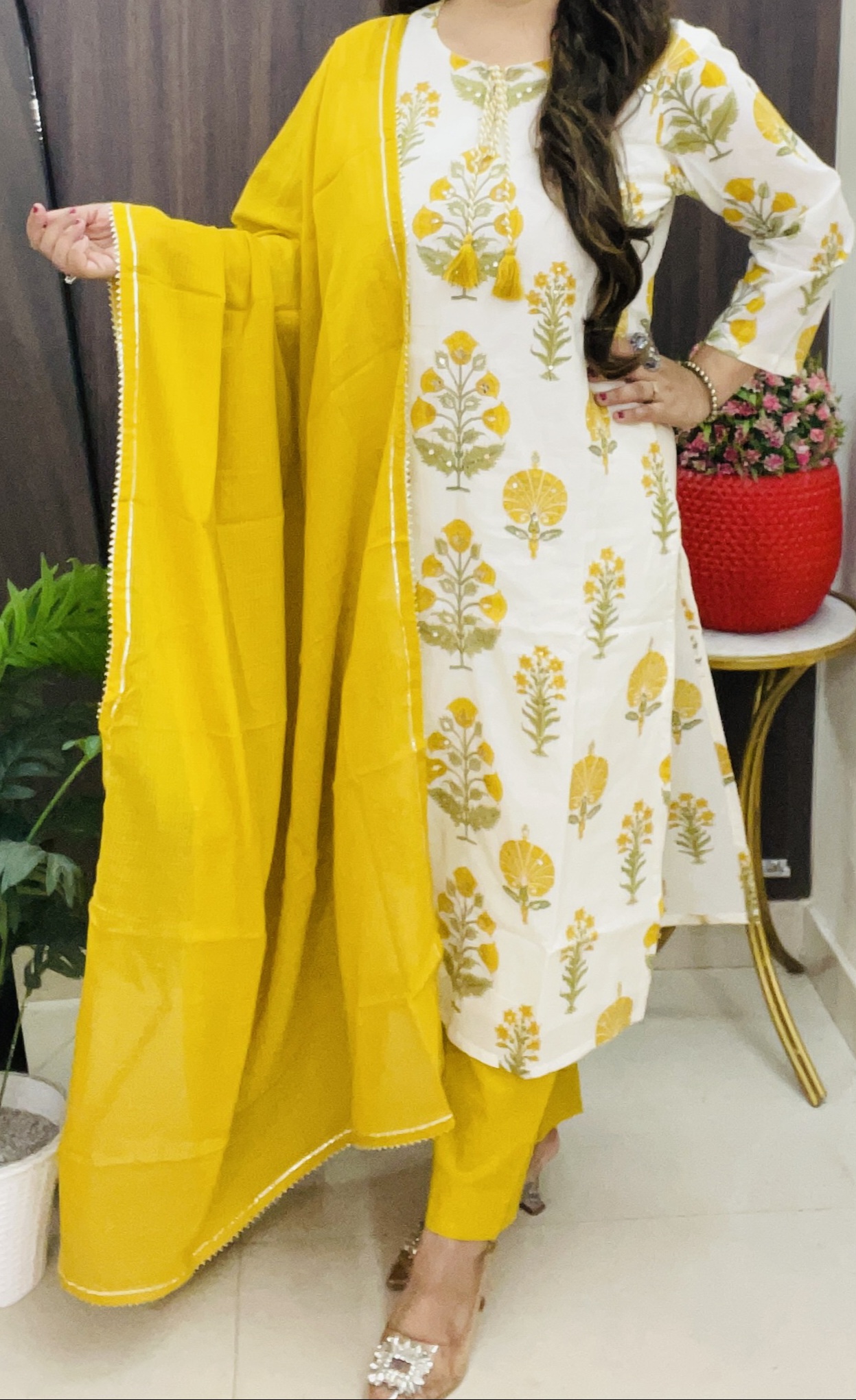 • Color: White base with yellow floral print, yellow dupatta