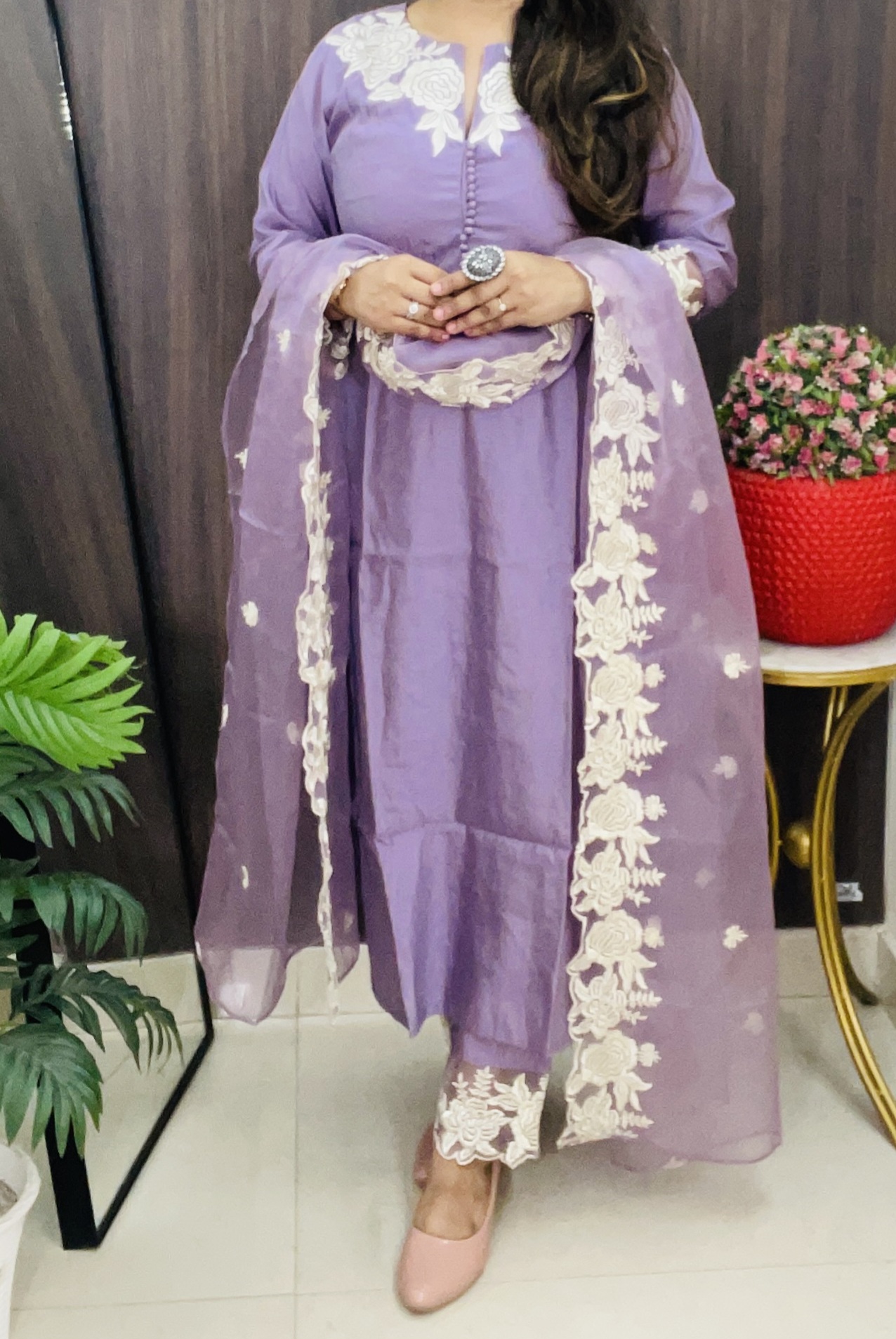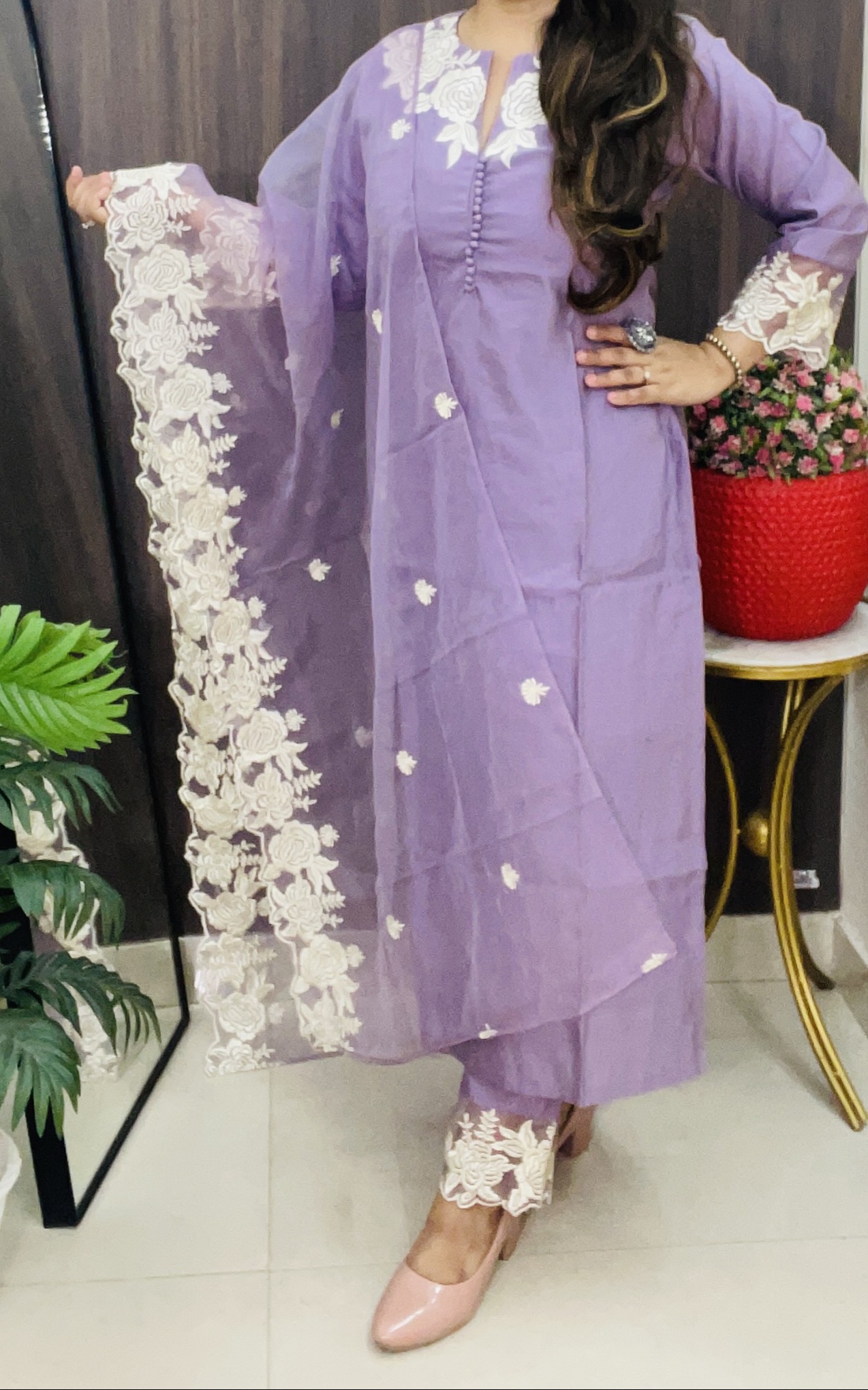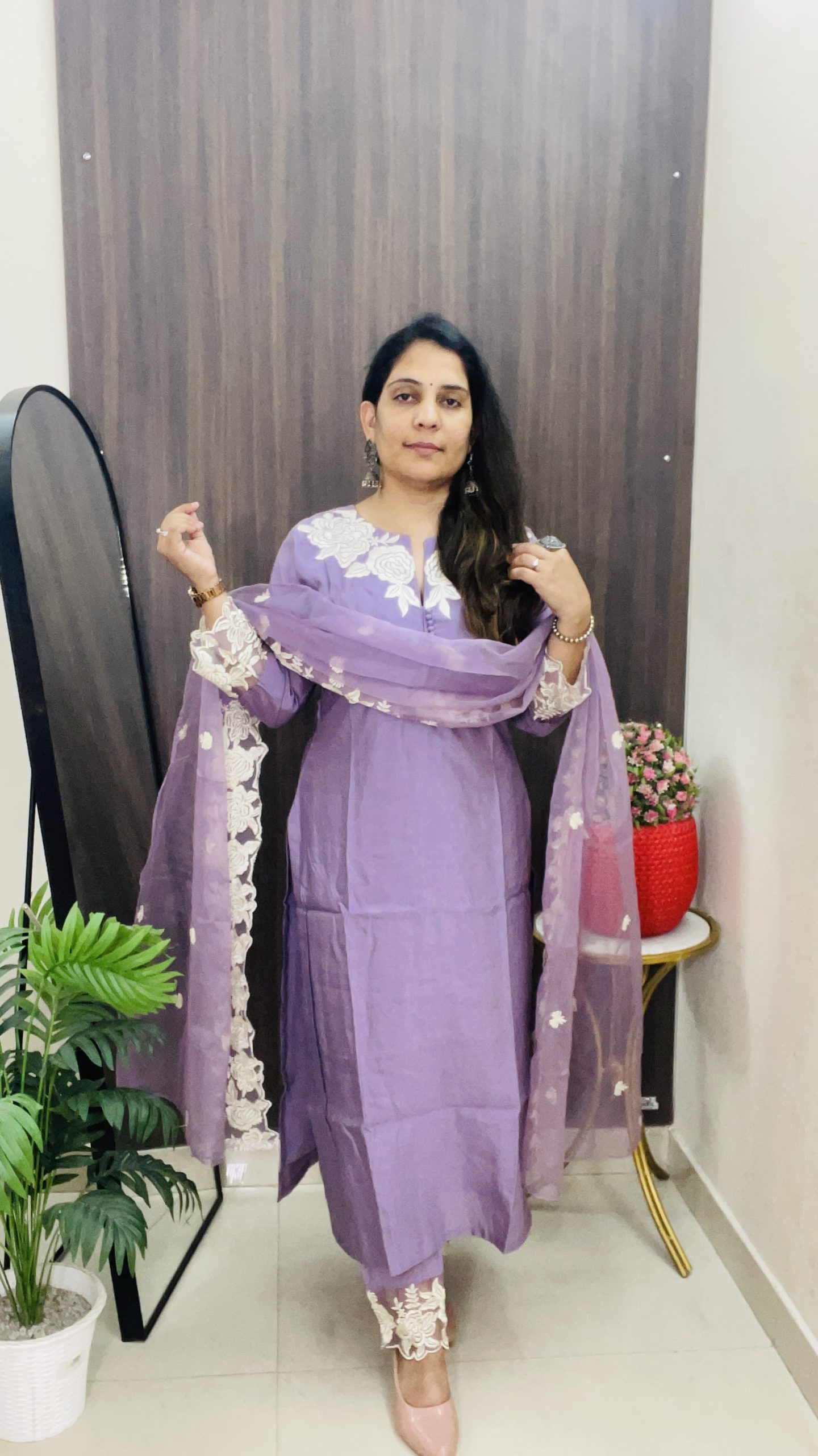 Grace meets simplicity in this lavender kurti pant dupatta set, adorned with white floral lace on the sleeves, neckline, and hem. The matching dupatta features lace trim that complements the understated charm of the outfit. Perfect for festive gatherings, light functions, or graceful daily wear, this outfit balances tradition with a modern pastel palette.