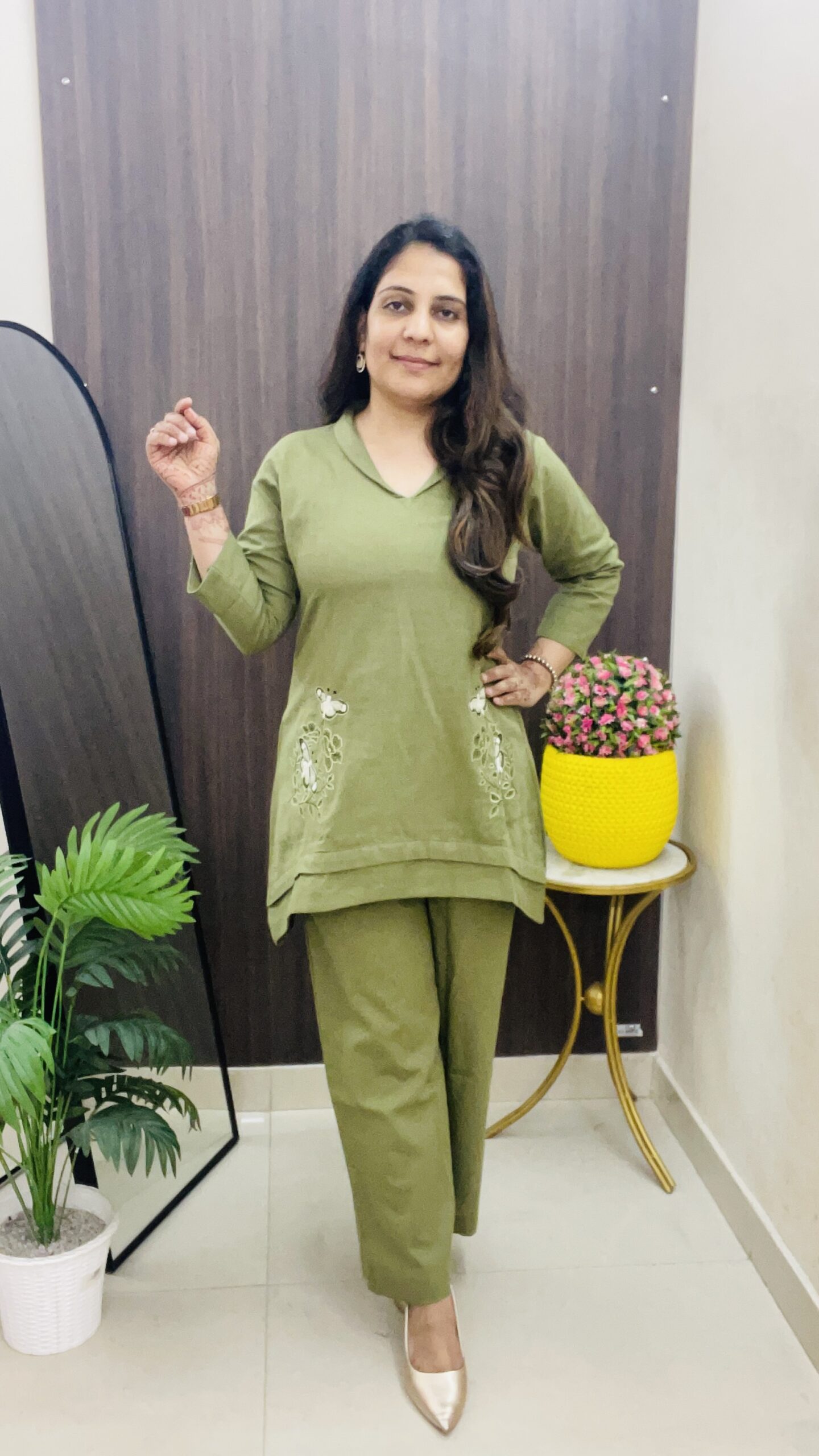 Step into effortless elegance with our Olive Green Embroidered V-Neck Cotton Co-Ord Set. Crafted from soft, breathable cotton, this outfit features a beautifully embroidered floral design on the kurta, three-quarter sleeves, and a flattering V-neckline. The matching pants offer a relaxed fit for all-day comfort, making it perfect for casual outings, festive gatherings, or even semi-formal events. Style meets simplicity in this must-have ethnic ensemble that keeps you looking graceful and feeling at ease.