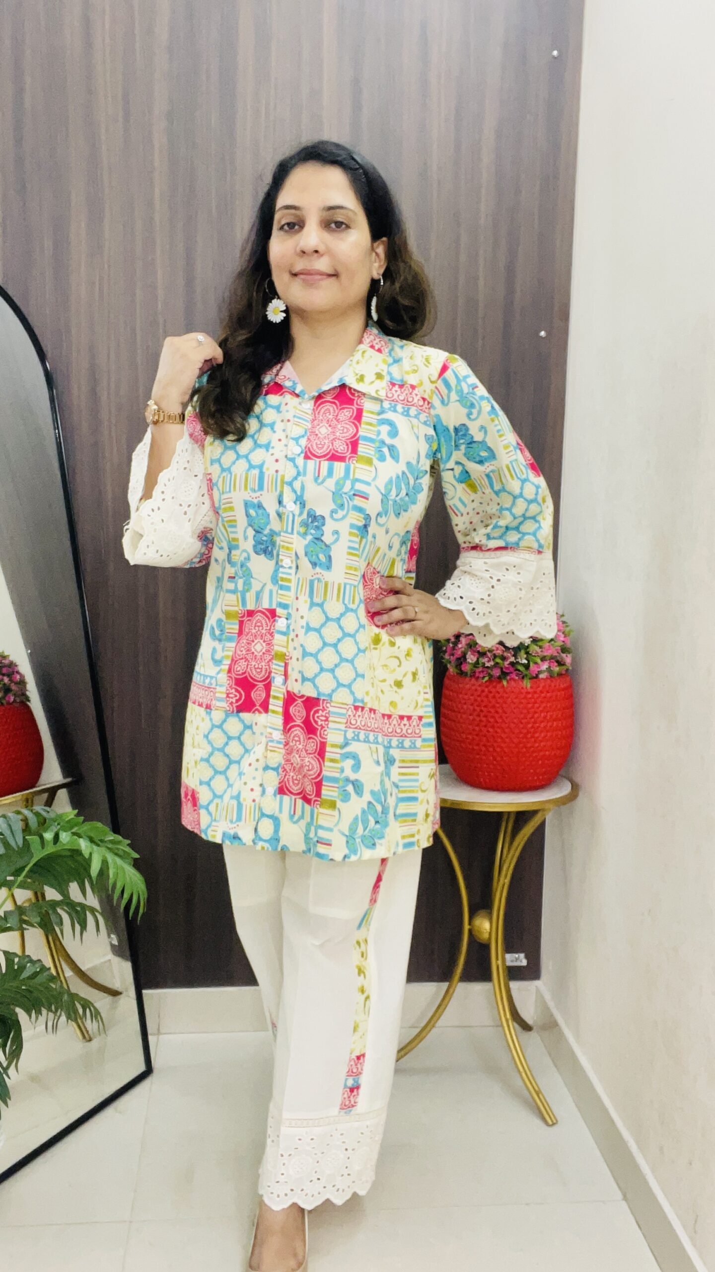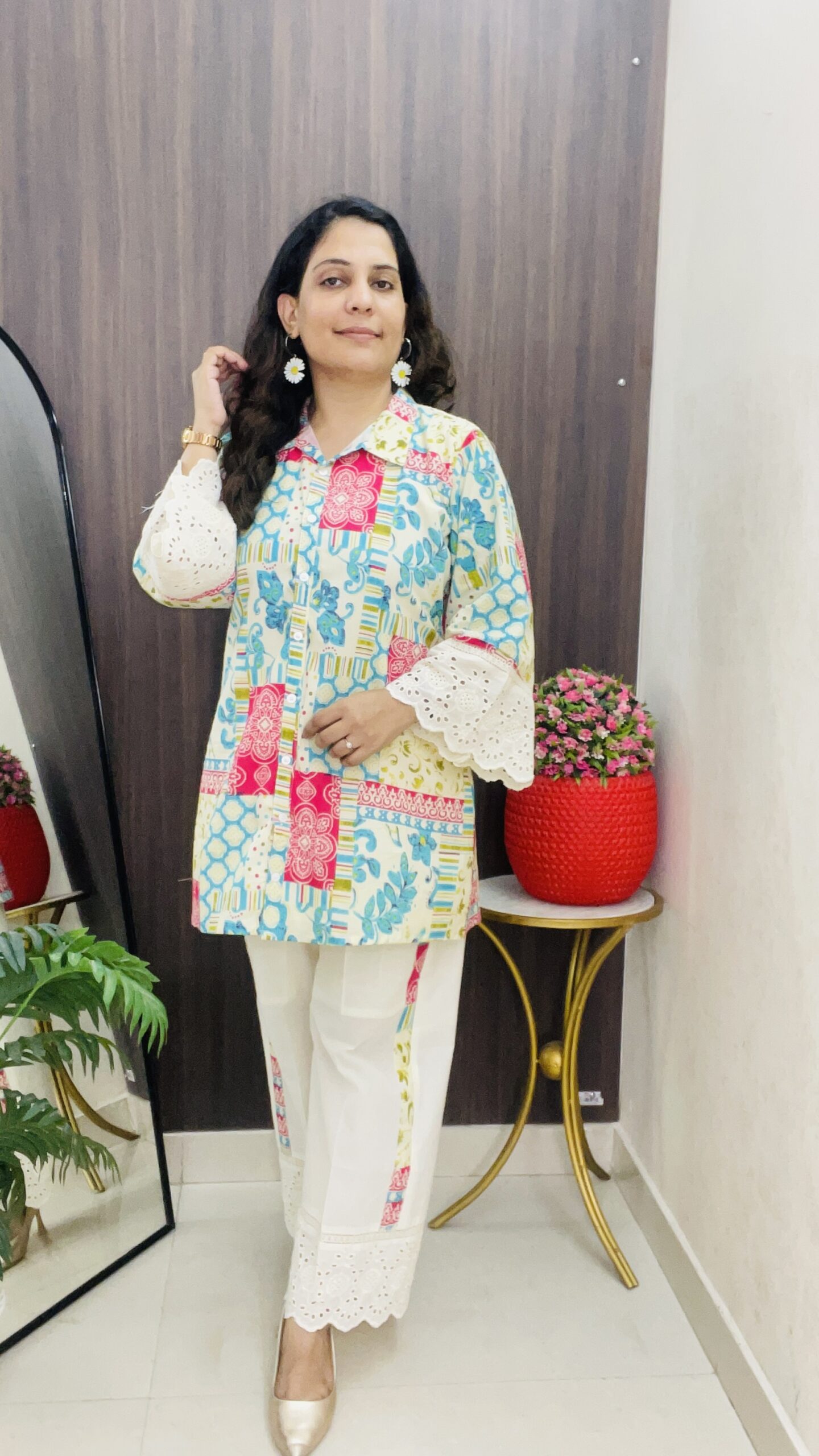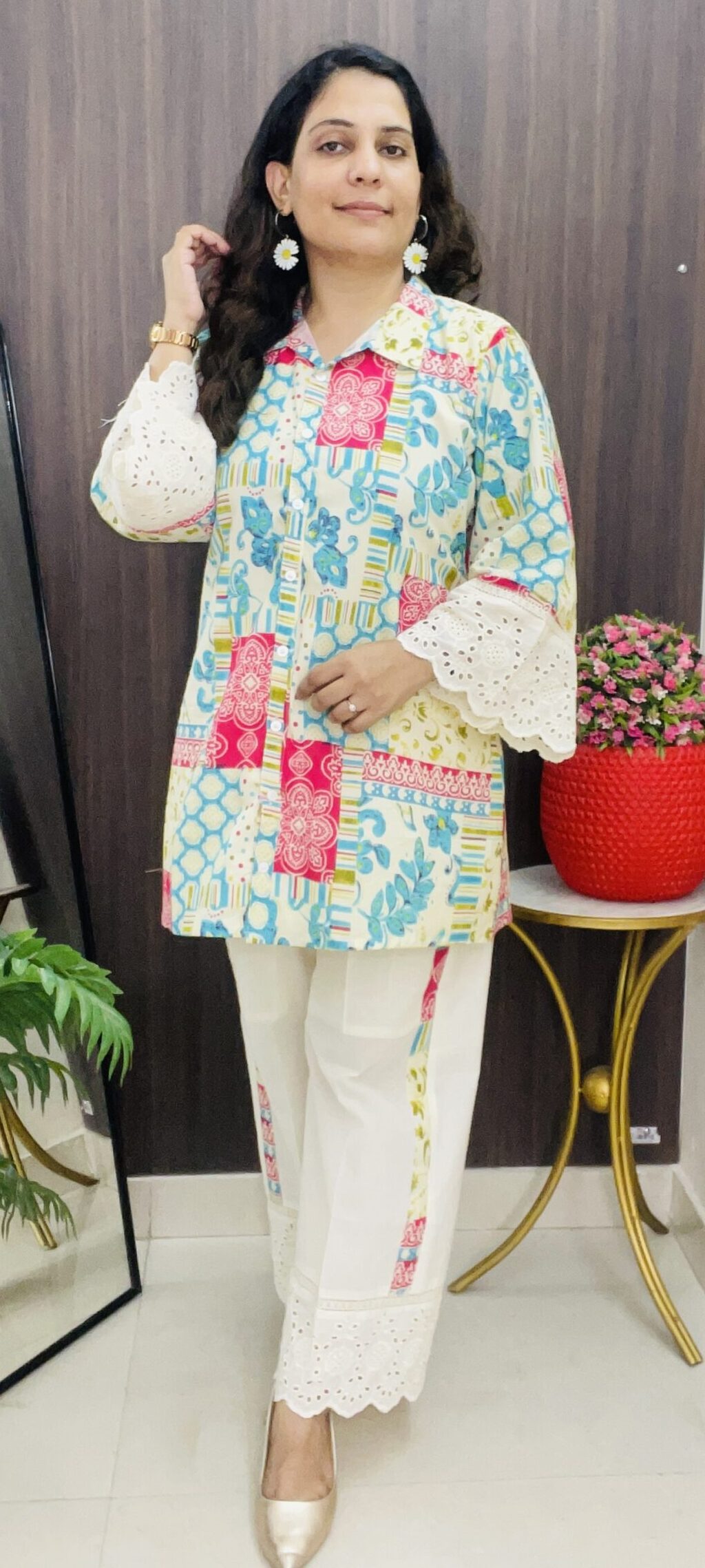 Premium Cotton Printed Shirt with front lining attached, designer schifli sleeves which adds elegance to this outfit, paired up with off white bell bottom pant with half lining and schifli detailing