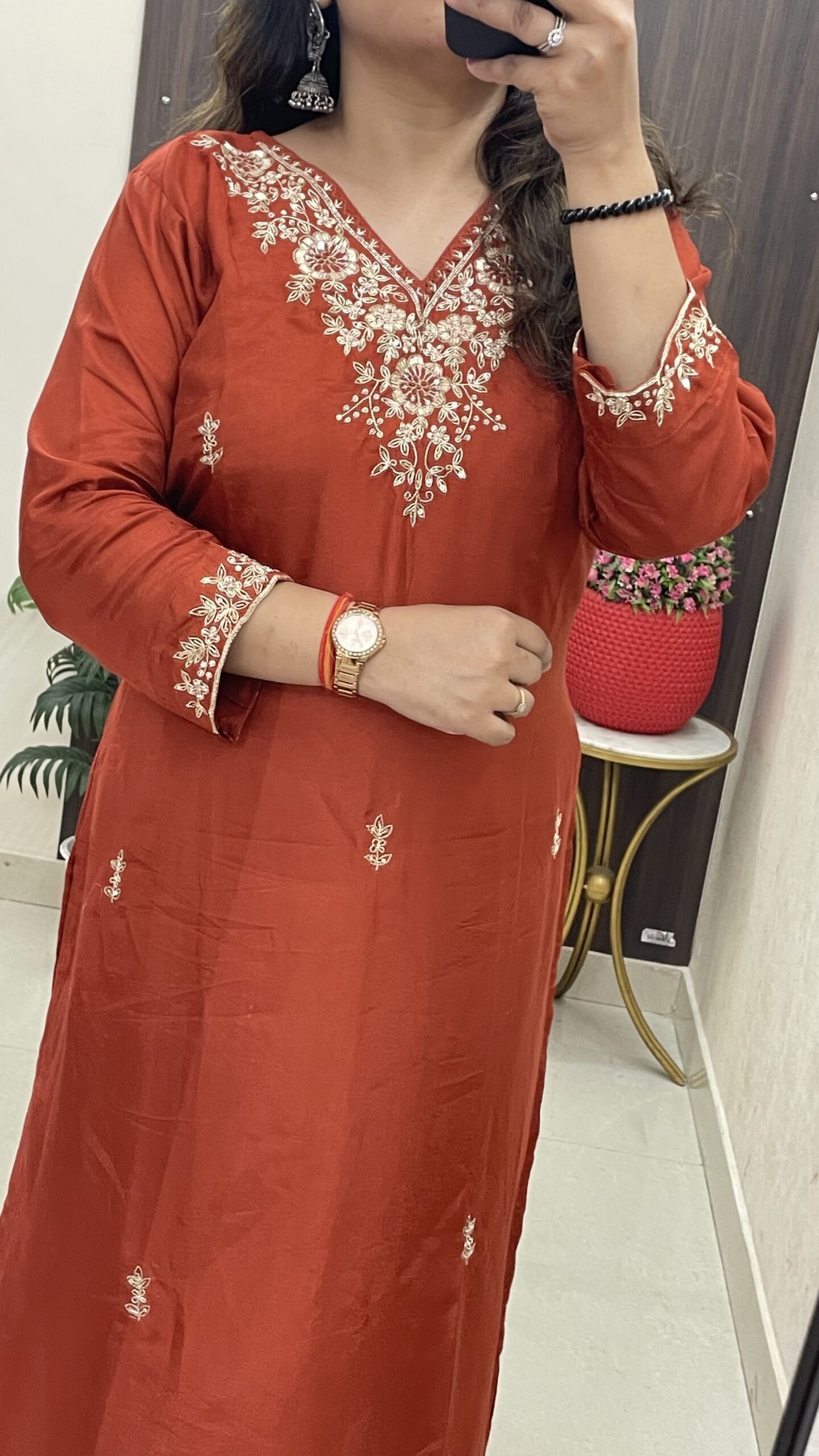 - Bottom (Silk Pant): Paired with comfortable silk pants (likely in the same matching rust color) for a cohesive and elegant monochromatic look.
